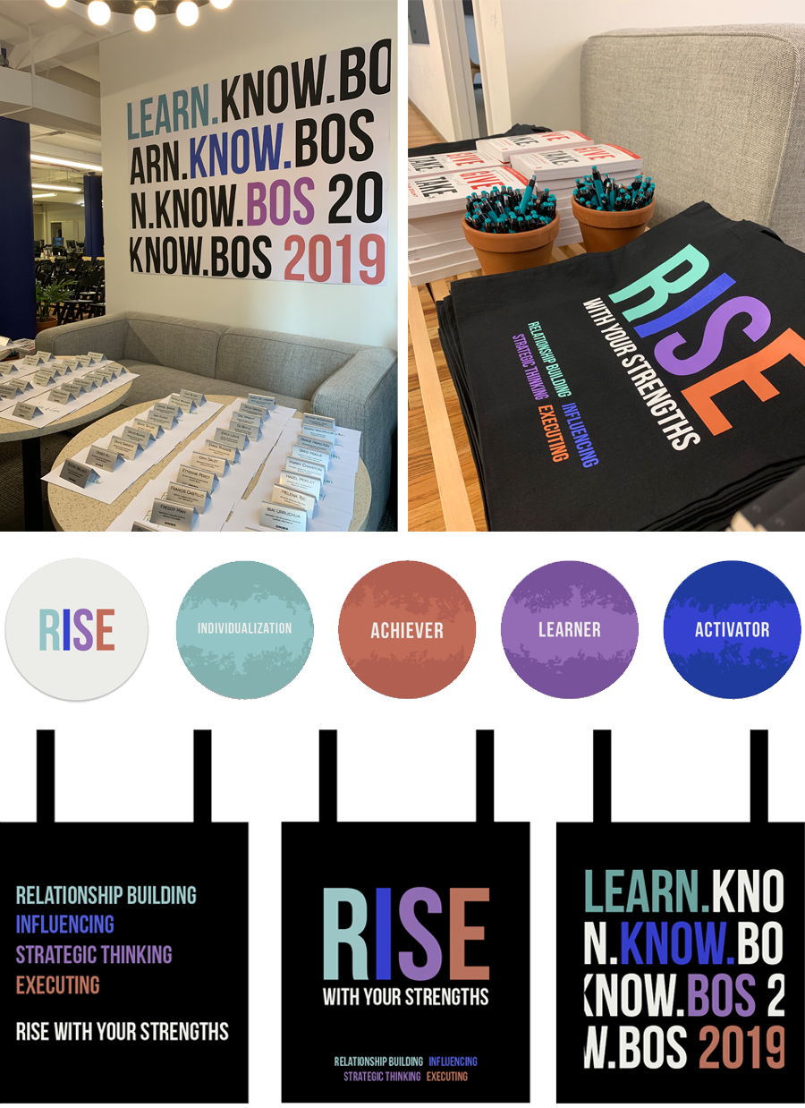Internal team strengths-building event branding and swag, including 35 stickers representing the event branding and each team member's top 5 strengths.