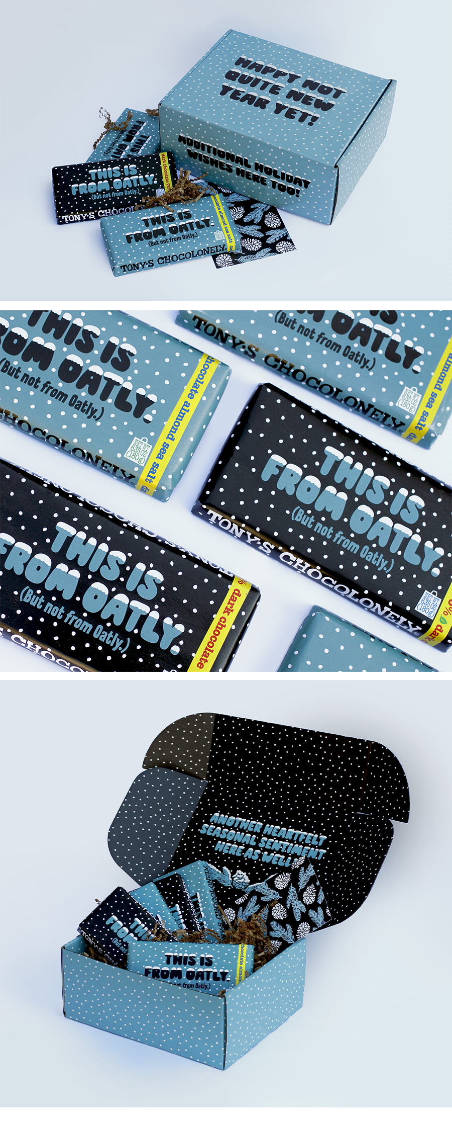 Box, chocolate bar wrappers, and postcard designs for Oatly to send to their team and cafe partners for the 2022 holiday season. Creative direction and photography by Malia Killings, words by Eric Routenberg.